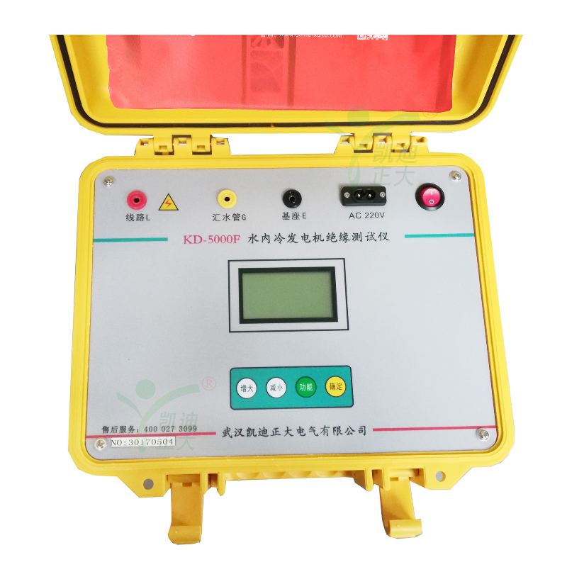 KD5000F水冷發(fā)電機(jī)絕緣電阻測試儀專用于水內(nèi)冷發(fā)電機(jī)的絕緣測量試驗(yàn),同時(shí)也可用于試驗(yàn)室或現(xiàn)場做其它材料的絕緣測試,輸出電流大于40mA。輸出電壓最大5000V,可測高達(dá)100GΩ的絕緣電阻。內(nèi)含高精度微電流測量系統(tǒng)、數(shù)字升壓系統(tǒng)。只需要用一條高壓線和一條信號線連接試品即可測量。測量自動進(jìn)行,結(jié)果由大屏幕液晶顯示,并將結(jié)果進(jìn)行存儲。不需對水極化電勢進(jìn)行補(bǔ)償調(diào)節(jié),機(jī)座與匯水管間的電阻小至3kΩ,也可保證測量準(zhǔn)確度,水阻大于80kΩ時(shí),可保證測試準(zhǔn)確度。并自動計(jì)算吸收比(R60S/R15S)和極化指數(shù)(R10min/R1min),自動儲存15秒、1分鐘、10分鐘的絕緣電阻值。也可用于變壓器等其他電力設(shè)備的絕緣電阻測試。