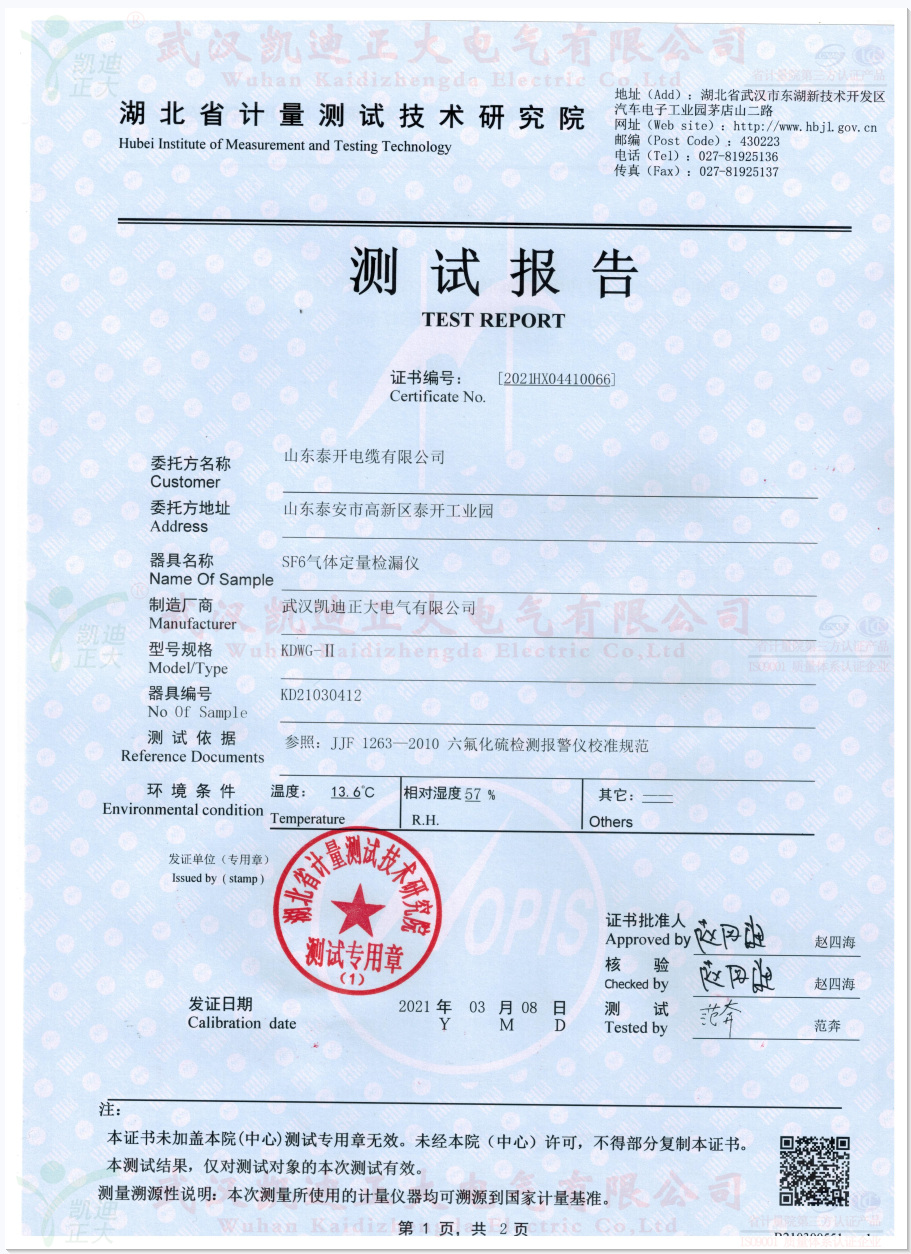 泰開電纜從事輸變電設(shè)備制造、低壓電器、專用汽車等多種行業(yè)的大型企業(yè)集團(tuán)。在輸變電行業(yè)具備了研發(fā)、生產(chǎn)與銷售550千伏及以下電壓等級(jí)輸配電設(shè)備總成套供貨、電站工程項(xiàng)目總承包建設(shè)的能力。需要六氟化硫的檢測(cè)設(shè)備,這次采購(gòu)的KDWG-II型SF6氣體定量檢漏儀用于設(shè)備的SF6氣體檢漏,我們?yōu)槠渫扑]了KDQH-12Y-54-150L氣體回收凈化裝置、KDQC-33氣體抽真空充氣裝置等設(shè)備。采購(gòu)的設(shè)備須有湖北省計(jì)量院的測(cè)試報(bào)告,這次獲得計(jì)量院測(cè)試報(bào)告。