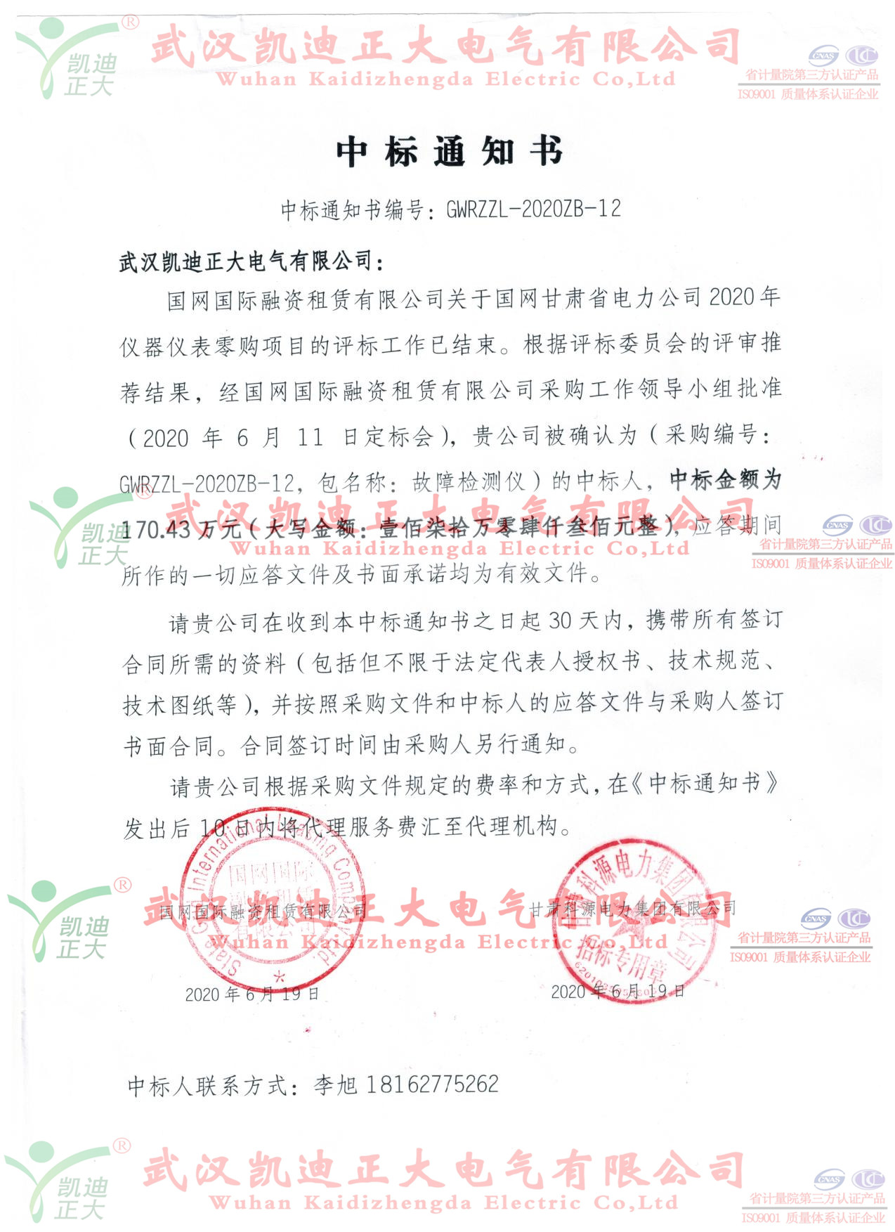 疫情結(jié)束了,一年一度的高考也結(jié)束了。該是分享成功的時(shí)候,我們倍感高興。武漢凱迪正大電氣有限公司迎來了國網(wǎng)國際融資租賃有限公司的中標(biāo)通知書,這是疫情解封武漢市以來我司獲得的第9張中標(biāo)通知書,中標(biāo)金額排名第三!