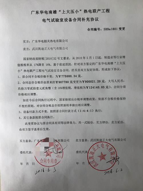 國(guó)家財(cái)政部財(cái)稅[2018]32號(hào)文要求,從2018年5月1日起,制造業(yè)等行業(yè)增值稅稅率從17%降至16%。基于前述原因,針對(duì)雙方簽定的廣東華電南雄“上大壓小”熱電聯(lián)產(chǎn)工程電氣試驗(yàn)室設(shè)備合同,經(jīng)買賣雙方友好協(xié)商,形成如下協(xié)議: