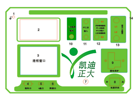 13.CT一次輸入口 14.機箱右側(cè)電源輸入,~220V(±10%)