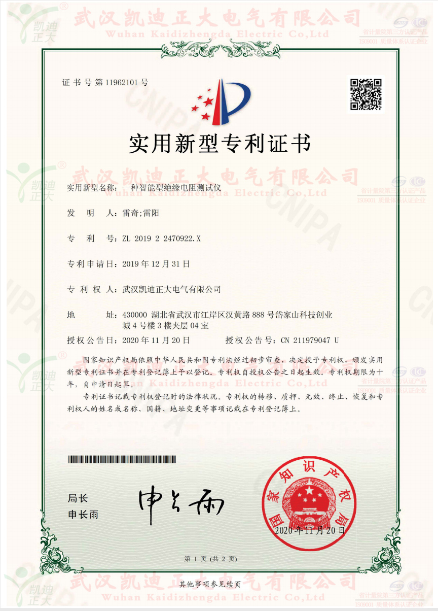1、一種智能型絕緣電阻測試儀,證書號第11962101號,專利號:ZL 2019 2 2470922.X,發(fā)明人:雷奇;雷陽,專利權(quán)人:武漢凱迪正大電氣有限公司,授權(quán)公告號:CN 211979047 U。