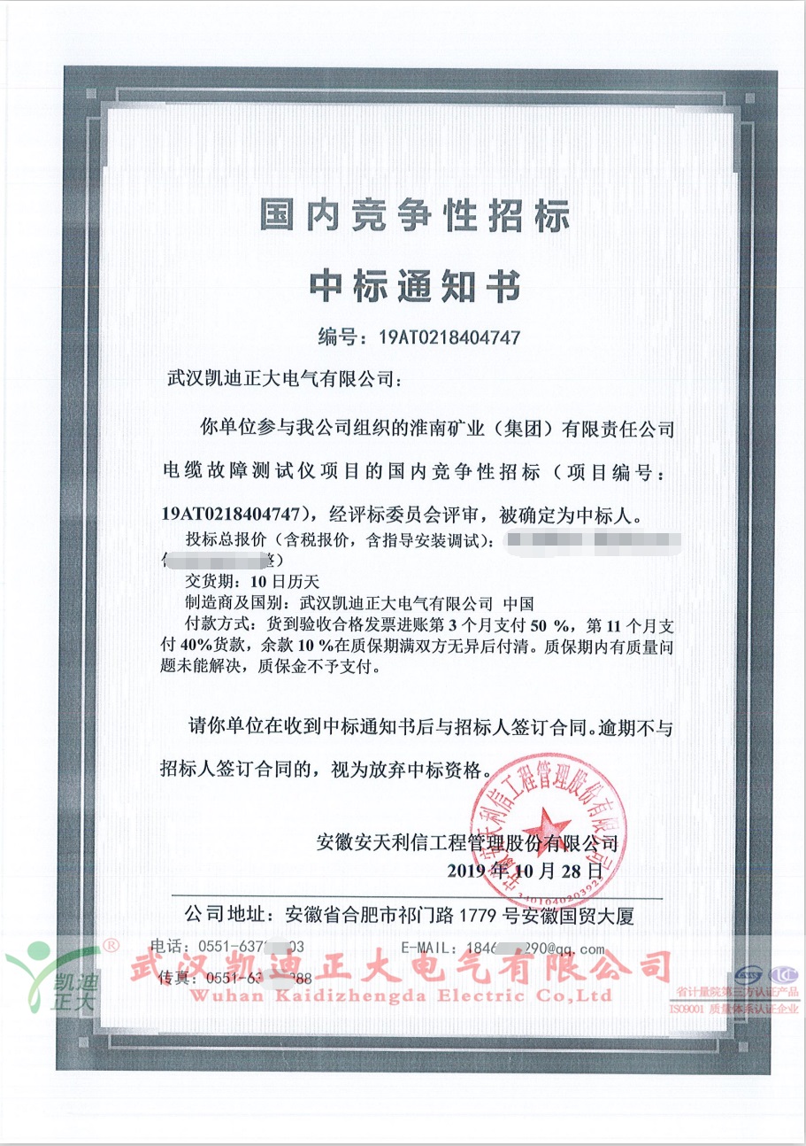 金九銀十,黃金節(jié)。武漢凱迪正大電氣公司參與淮南礦業(yè)(集團(tuán))有限責(zé)任公司電纜故障測(cè)試儀項(xiàng)目投標(biāo),在經(jīng)過嚴(yán)正的評(píng)標(biāo),最終確認(rèn)武漢凱迪正大電氣有限公司為第一中標(biāo)人。