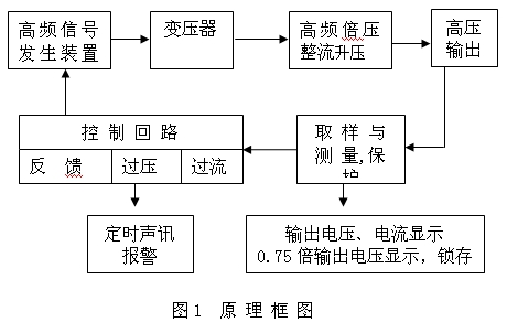 凱迪正大系列直流高壓發(fā)生器應用最新電力電子技術,采用高新的PWM調(diào)制技術及大功率MOSFET器件,通過中頻倍壓整流而成;該發(fā)生器具有紋波系數(shù)小、輸出穩(wěn)定可靠,體積小、重量輕的特點,且具有可靠、靈敏的內(nèi)部保護功能,其原理框圖如圖所示。