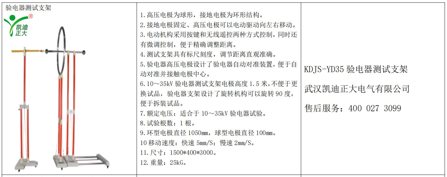 高壓電極為球形,接地電極為環(huán)形結(jié)構(gòu)。接地電極固定、高壓電極可以電動(dòng)驅(qū)動(dòng)向左右移動(dòng)。電動(dòng)機(jī)構(gòu)采用按鍵和無線遙控兩種方式控制,同時(shí)還有微調(diào)控制,便于精確調(diào)整距離。測試支架具有標(biāo)尺刻度,調(diào)節(jié)距離直觀準(zhǔn)確。驗(yàn)電器高壓電極設(shè)計(jì)了驗(yàn)電器自動(dòng)對準(zhǔn)裝置,便于自動(dòng)對準(zhǔn)并接觸電極中心。10~35kV驗(yàn)電器測試支架電極高度1.5米,不便于更換試品,驗(yàn)電器支架設(shè)計(jì)了旋轉(zhuǎn)機(jī)構(gòu)可以旋轉(zhuǎn)90度,便于拆裝試品。額定電壓:適合于10~35kV驗(yàn)電器試驗(yàn)。試驗(yàn)根數(shù):1根。環(huán)型電極直徑1050mm,球型電極直徑100mm。移動(dòng)速度:快速5mm/S;慢速2mm/S。尺寸:1500*400*3000。重量:25kG。