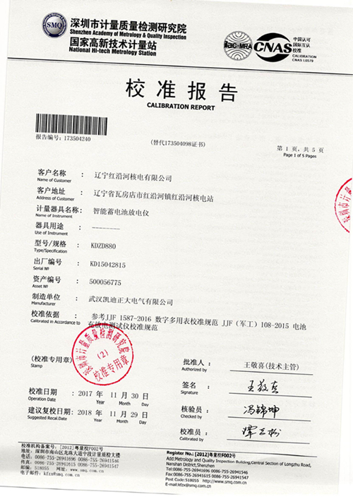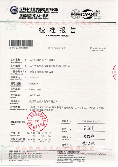 應(yīng)中廣核遼寧紅沿河核電有限公司的需求,將武漢凱迪正大電氣公司生產(chǎn)的KDZD880(110V80A)智能蓄電池放電儀出具國(guó)家高新技術(shù)研究院的計(jì)量報(bào)告后才能使用。校準(zhǔn)報(bào)告:173504097證書(shū)號(hào),出廠編號(hào):KD14122815,資產(chǎn)編號(hào):500077905,校準(zhǔn)依據(jù):參考JJF158-2016數(shù)字多用表校準(zhǔn)規(guī)范JJF(軍工)108-2015電池充放電測(cè)試儀校準(zhǔn)規(guī)范。嚴(yán)格出具檢定合格報(bào)告。