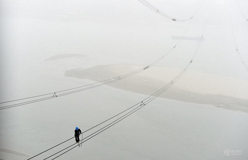 3月16日,國網(wǎng)湖北電力檢修公司鄂西北運維分部的檢修工在漢江大跨越走線檢查間隔棒的運行情況。新華社記者郝同前攝