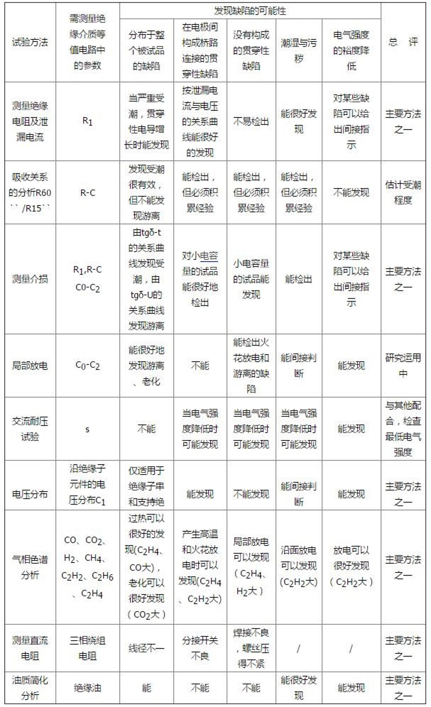 從表中可見,每種試驗方法都只能發(fā)現(xiàn)某一方面的絕緣缺陷,因此,單靠一種試驗方法,有時很難判斷絕緣好壞,須根據(jù)各種試驗方法的特點和試驗結(jié)果,相互比較與補(bǔ)充,力求作出準(zhǔn)確的判斷。這就要求我們在實際工作中,掌握各種試驗方法,注意提高綜合試驗分析的能力。