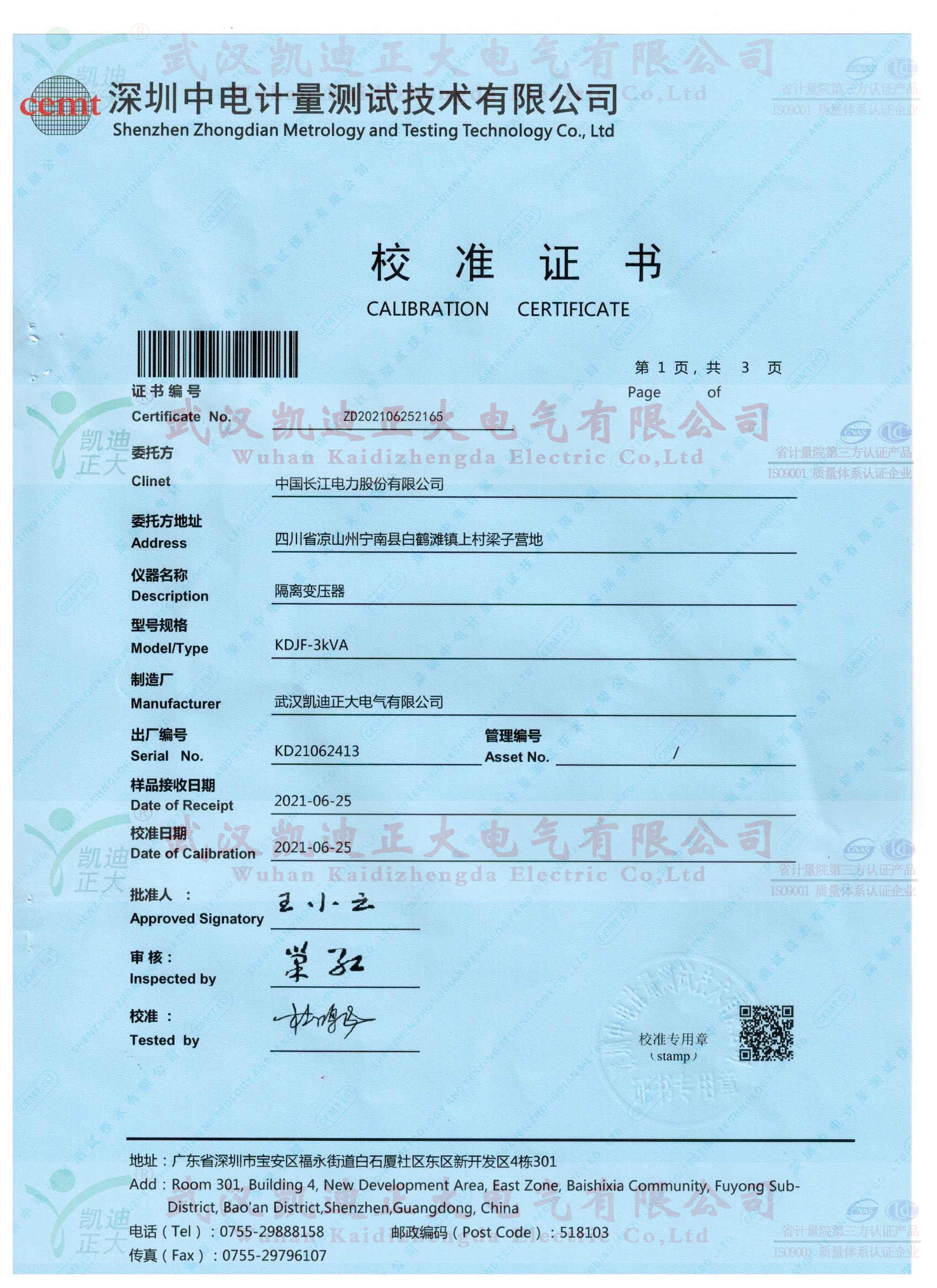長江電力這次購買的隔離變壓器KD-JF3KVA獲得了中電計(jì)量的校準(zhǔn)證書,證書號(hào):ZD202106252165委托方:中國長江電力股份有限公司,地址:四川省涼山州寧南縣白鶴灘鎮(zhèn)上村梁子營地。隔離變壓器主要用于互感器、電力變壓器、高壓斷路器、耦合電容器、電容套管、開關(guān)等試品進(jìn)行工頻耐壓、局部放電及其他科學(xué)試驗(yàn)研究。KDQJF-30kVA/100kV無局放SF6工頻耐壓試驗(yàn)裝置采用充氣式無局放試驗(yàn)變壓器做為高壓電源,經(jīng)過KD-JF3KVA隔離濾波裝置,取得50Hz正弦波為純凈局放量≤2PC的高壓電源,波形失真≤5%然后經(jīng)無局放耦合電容器取得高壓電路中的脈沖信號(hào)經(jīng)局放儀檢測被試品的局放量。本套設(shè)備參照GB/T16927.1高電壓試驗(yàn)技術(shù)第一部分一般試驗(yàn)要求;DL/T 848.3高壓試驗(yàn)裝置通用技術(shù)條件 第3部分:無局放試驗(yàn)變壓器等相關(guān)標(biāo)準(zhǔn)。