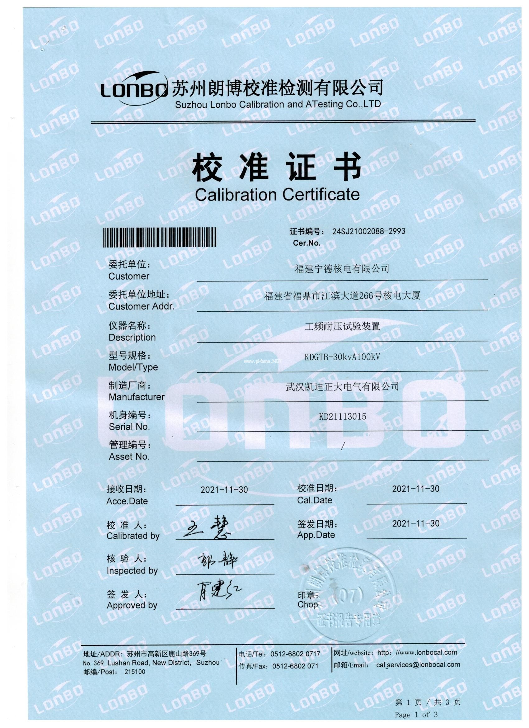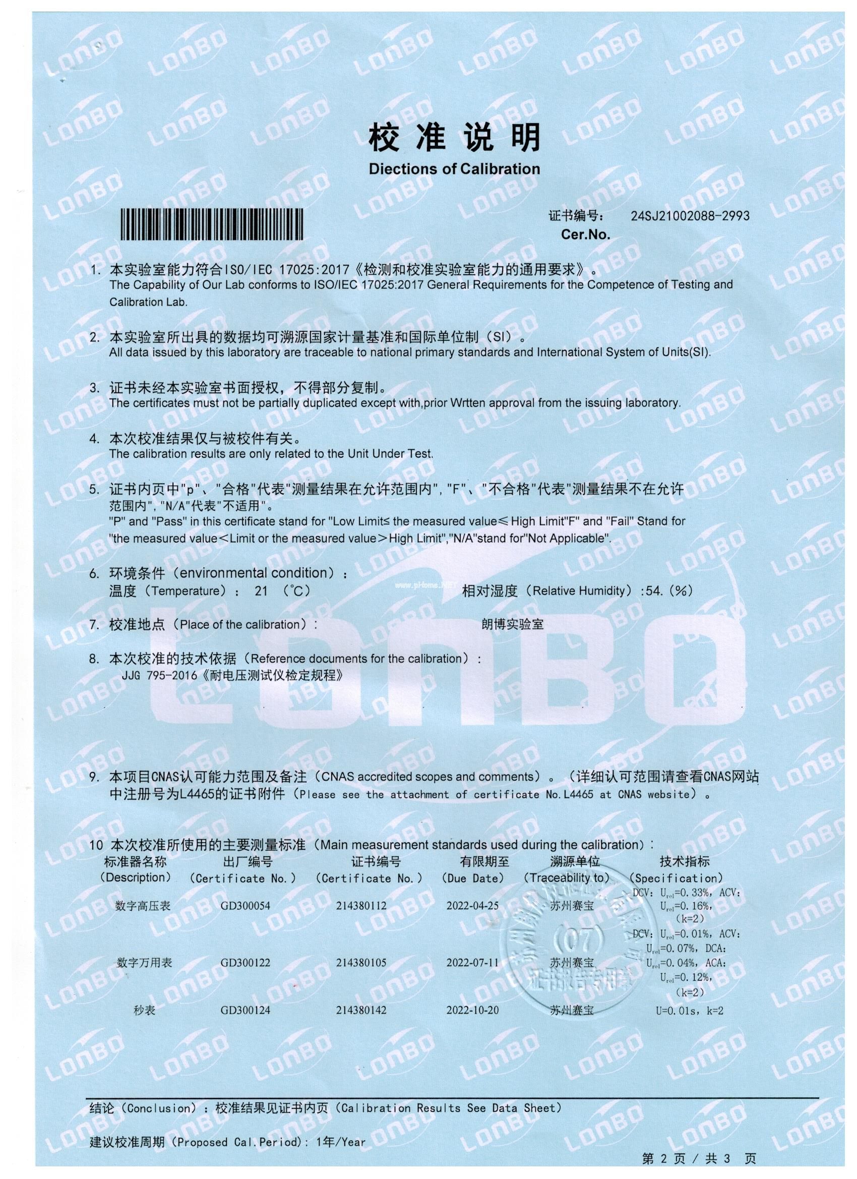 工頻耐壓試驗裝置,并由甲方委托蘇州朗博校準(zhǔn)檢測有限公司出具檢測報告。