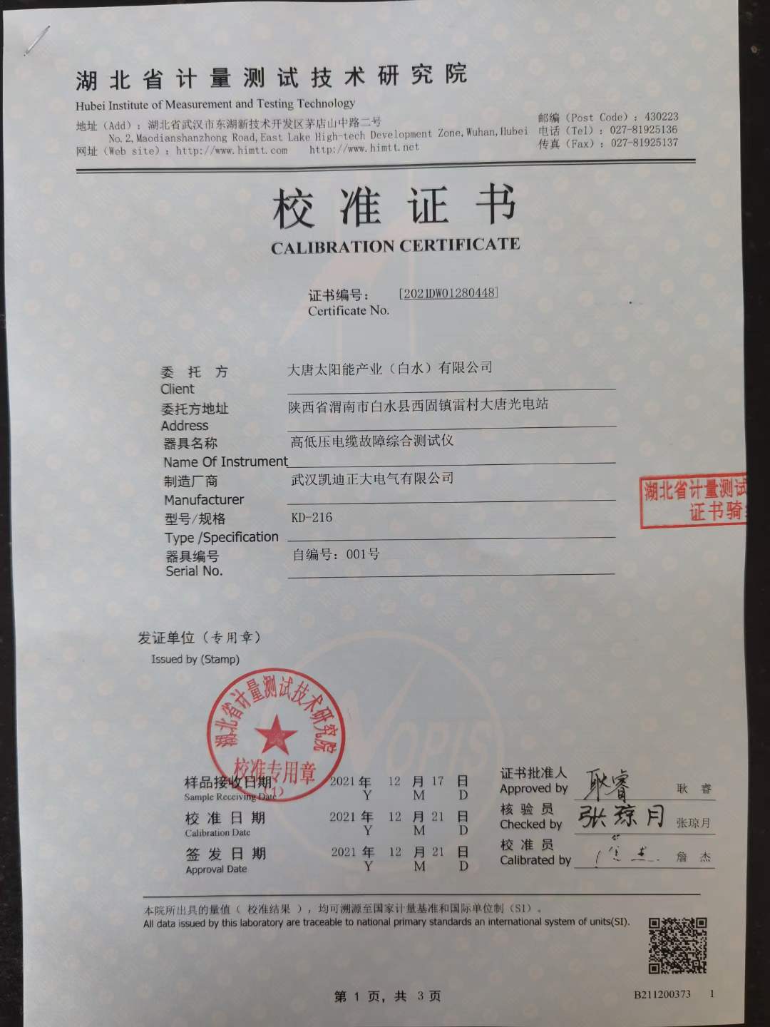 2021年12月22日,大唐太陽能產(chǎn)業(yè)(白水)有限公司采購我公司一批高低壓電纜故障綜合測試儀。為彰顯本公司產(chǎn)品的實力與質(zhì)量,凱迪正大雷總攜帶本公司生產(chǎn)的KD-216高低壓電纜故障綜合測試儀前往湖北省計量測試技術(shù)研究院中南國家計量測試中心對產(chǎn)品進行檢測,經(jīng)過多次測量與檢測后,產(chǎn)品完整通過每一條檢測并獲得了校準(zhǔn)證書。