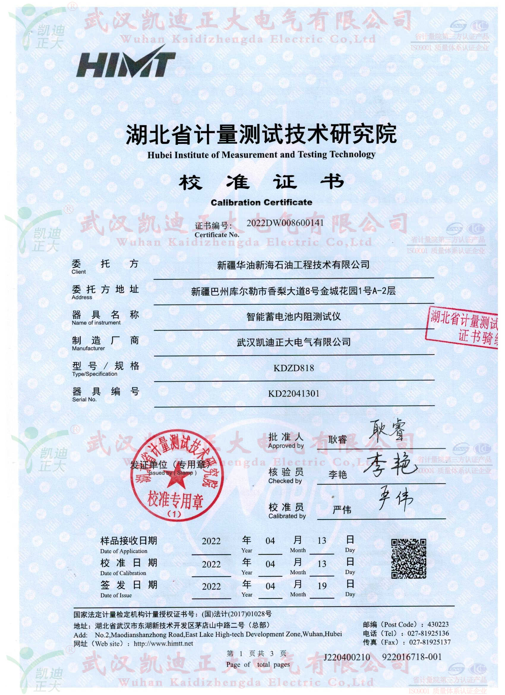 今年3月份,新疆華油工程部劉工致電我司。吐槽之前買的一批揚州某公司設(shè)備,使用不是很理想。這次選擇我們的KDZD818智能蓄電池內(nèi)阻測試儀、KDZD882智能蓄電池放電監(jiān)測儀等設(shè)備。話說“一朝被蛇咬十年怕井繩”,這次購買設(shè)備還是對比武漢幾家企業(yè)后綜合售后服務(wù)、品牌力、設(shè)備性能對比選擇我司,簽署技術(shù)協(xié)議并要求獲得湖北省計量測試技術(shù)研究院檢定報告,對于這些常規(guī)要求,我司幾乎有實力、有信心能夠獲得計量證書。