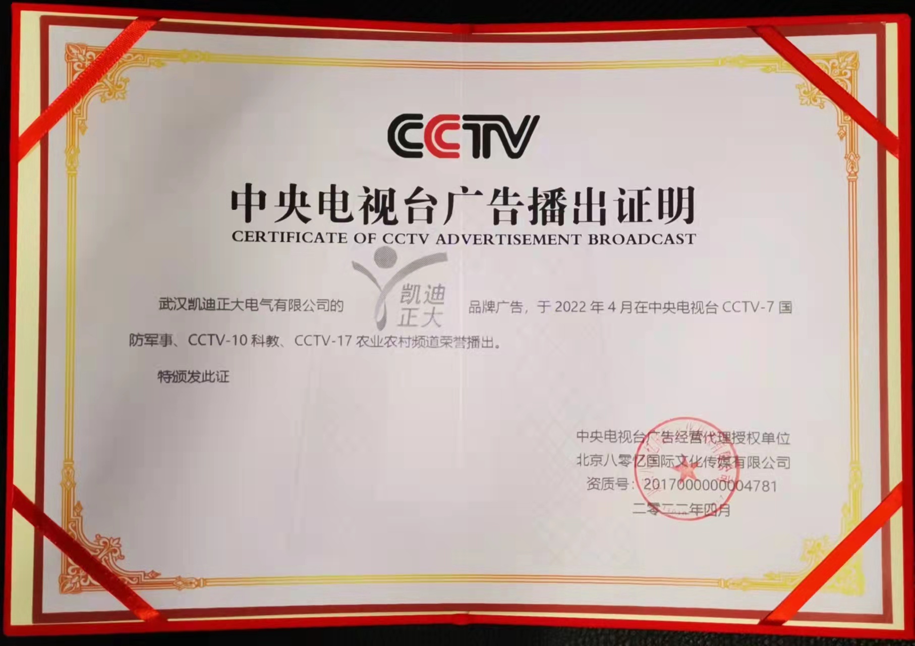 2022年4月,武漢凱迪正大電氣有限公司品牌廣告正式登陸中央電視臺CCTV-7國防軍事頻道、CCTV-10科教頻道及CCTV-17農(nóng)業(yè)農(nóng)村頻道,向全國觀眾展示武漢凱迪正大的實力與信念。
