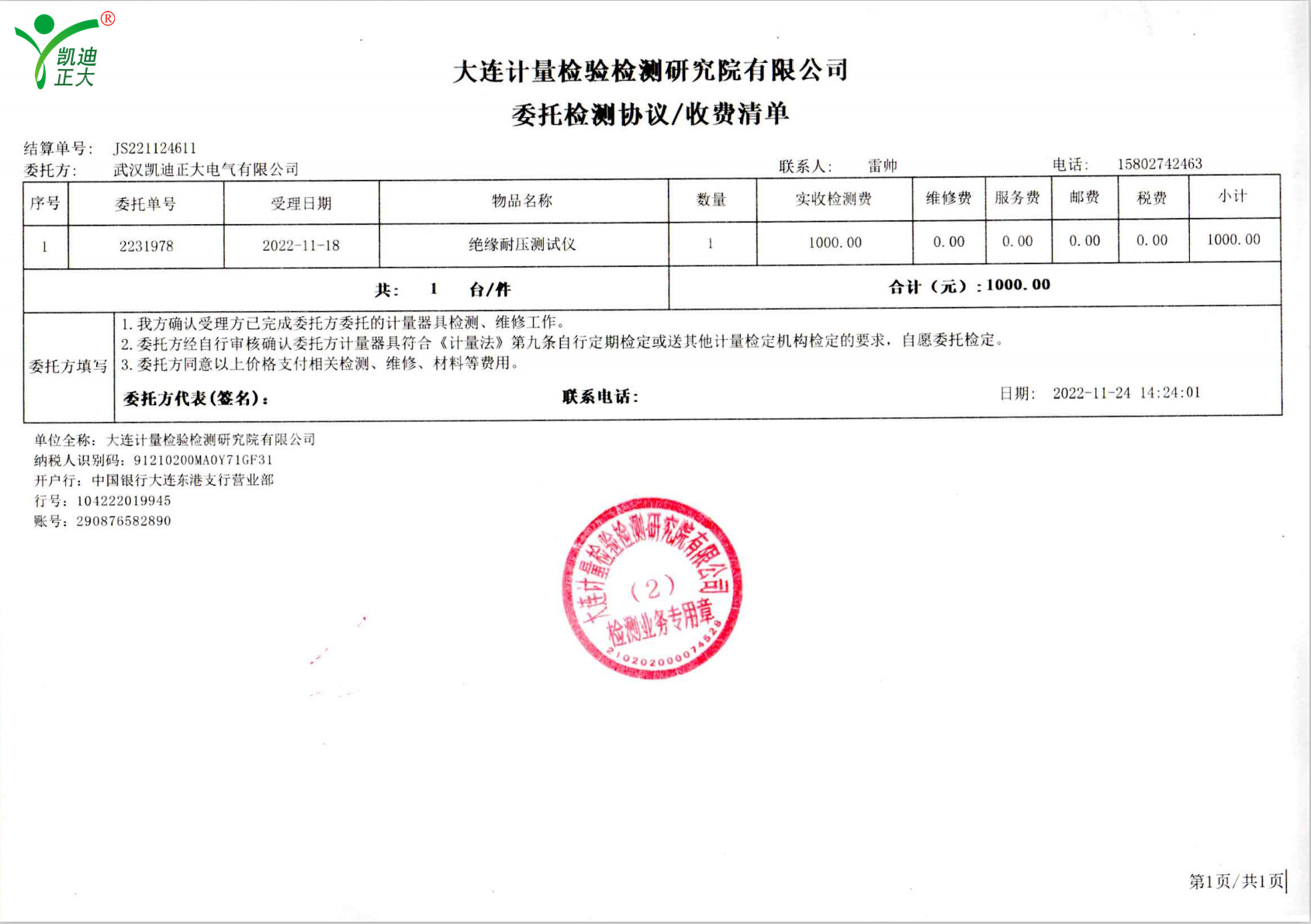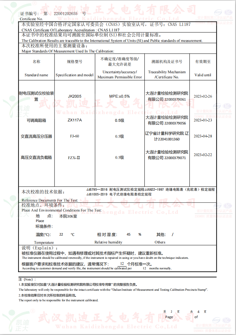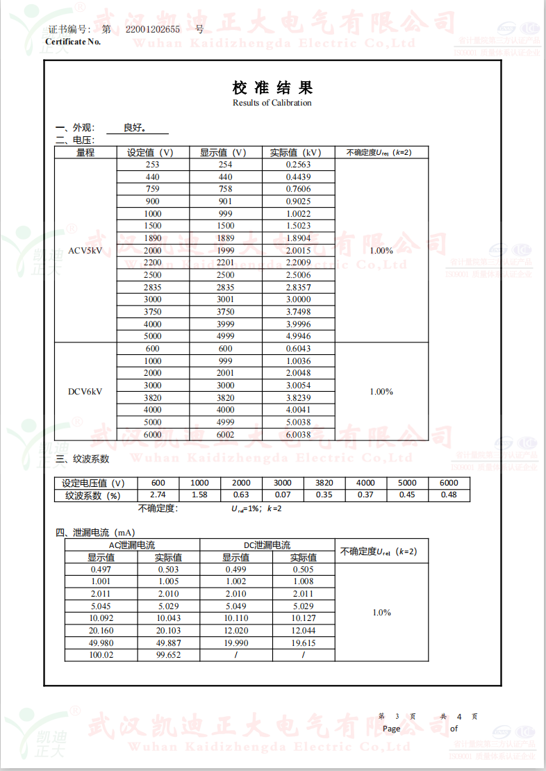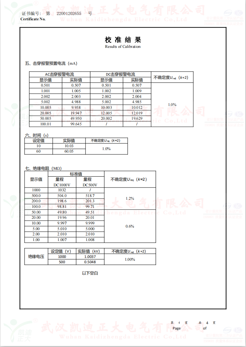 低壓成套開關(guān)柜KD7742智能耐壓絕緣測(cè)試儀根據(jù)公司制度標(biāo)準(zhǔn)需要獲得中國(guó)認(rèn)可國(guó)際互認(rèn)校準(zhǔn)CNAS檢定機(jī)構(gòu),大連計(jì)量檢驗(yàn)檢測(cè)研究院有限公司出具《KD7742智能耐壓絕緣測(cè)試儀校準(zhǔn)證書》,證書編號(hào):第22001202655號(hào);使用耐電壓測(cè)試儀校驗(yàn)裝置(溯源機(jī)構(gòu)大連計(jì)量檢驗(yàn)檢測(cè)研究院)、ZX117A可調(diào)高阻箱(溯源機(jī)構(gòu)大連計(jì)量檢驗(yàn)檢測(cè)研究院)、FJ-60交直流高壓分壓器(溯源遼寧省計(jì)量科學(xué)研究院)、FZX-II高壓交直流負(fù)載箱(溯源機(jī)構(gòu)大連計(jì)量檢驗(yàn)檢測(cè)研究院)等檢定設(shè)備。