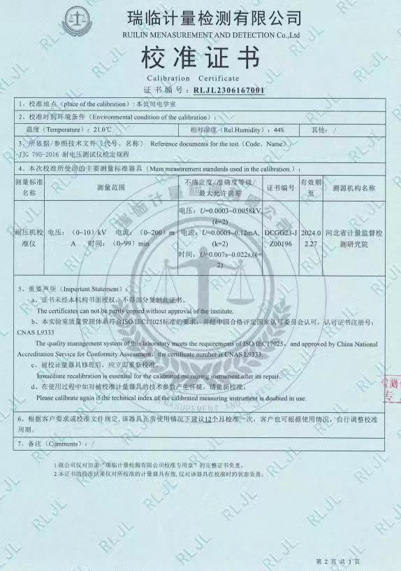 河間市質(zhì)量技術(shù)監(jiān)督檢驗所采購工頻高壓測試臺獲瑞臨計量檢測報告