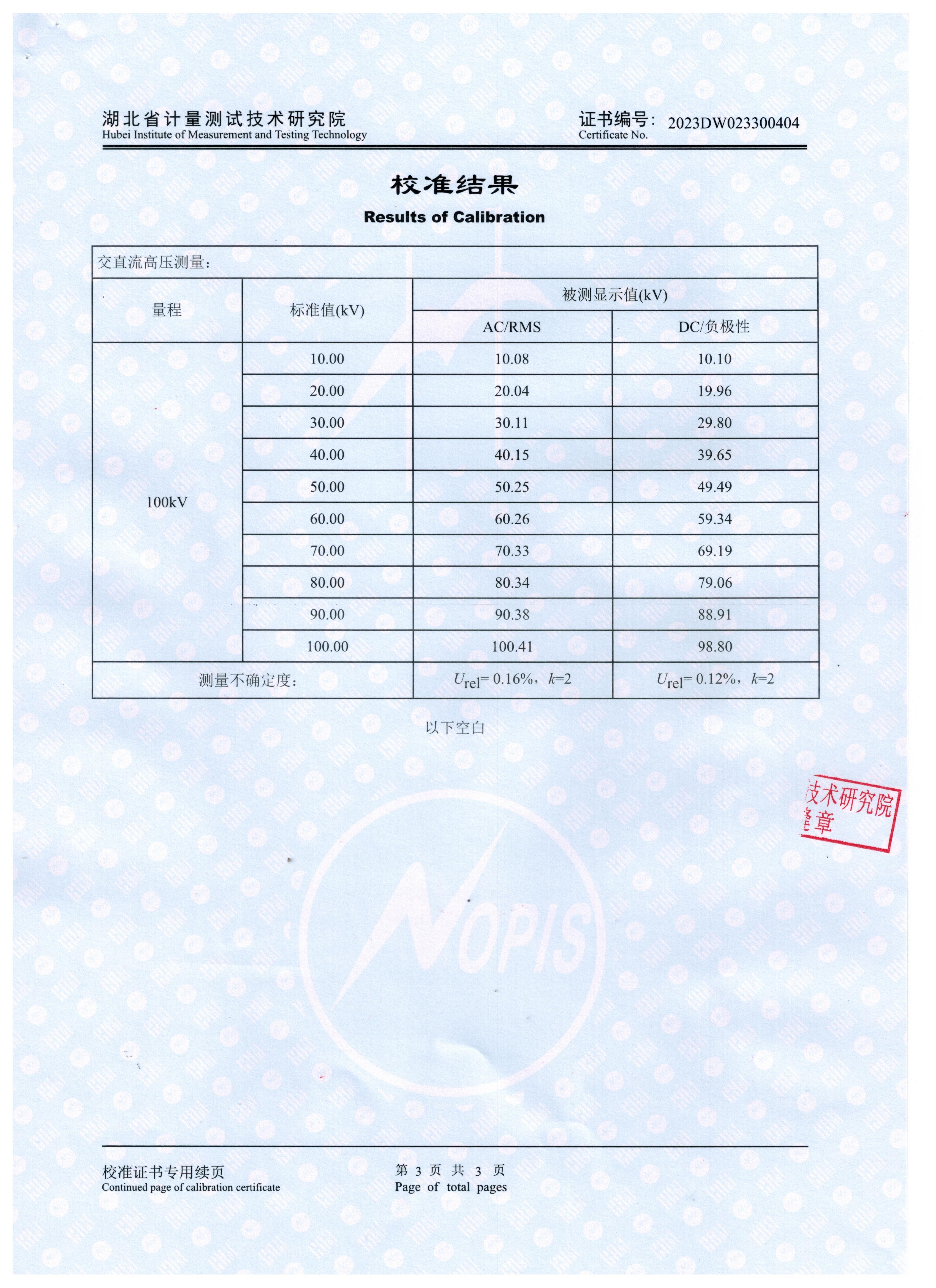 參照 JJG 496-2016 《工頻高壓分壓器》、JJG 1007-2005《直流高壓分壓器鑒定規(guī)程》 檢定要求,KDFCR-100 交直流兩用分壓器獲得證書(shū)2023DW023300404檢定證書(shū)。