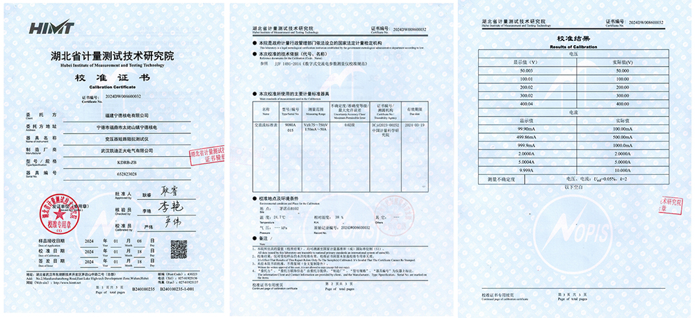 2024年1月18日,福建寧德核電有限公司從武漢凱迪正大電氣采購的KDRB-ZB變壓器短路阻抗測試儀,經(jīng)過湖北省計量測試技術(shù)研究院的嚴格校準,技術(shù)指標、性能均符合要求,為客戶變壓器測試工作提供了更加精準、可靠的保障。這一校準不僅彰顯了凱迪正大電氣產(chǎn)品的品質(zhì),也突顯了凱迪正大電氣在保障電力安全方面的產(chǎn)品實力。