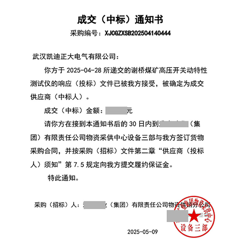 恭喜武漢凱迪正大成功中標(biāo)淮南某集團(tuán)高壓開(kāi)關(guān)動(dòng)特性測(cè)試儀項(xiàng)目