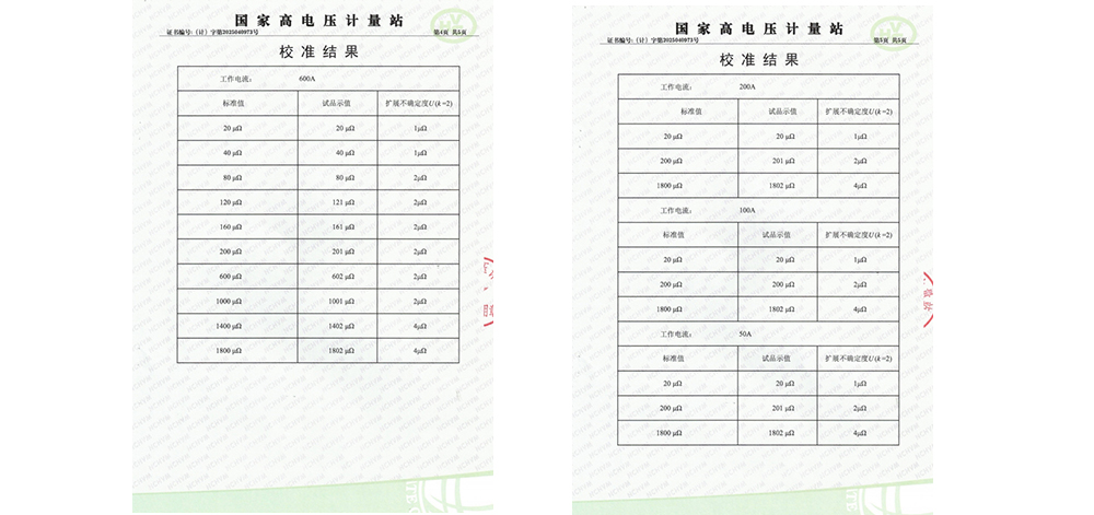 在校準過程中,國家高電壓計量站采用了最大充許誤差為±0.1%讀數(shù)的直流大功率標準電阻作為校準器具,校準環(huán)境為溫度21℃℃、濕度56%RH。校準內(nèi)容包括對測試儀在600A、200A、100A、50A不同電流下的測量結(jié)果。經(jīng)過一系列嚴格的測試和比對,KDHL-600A回路電阻測試儀成功通過了校準。